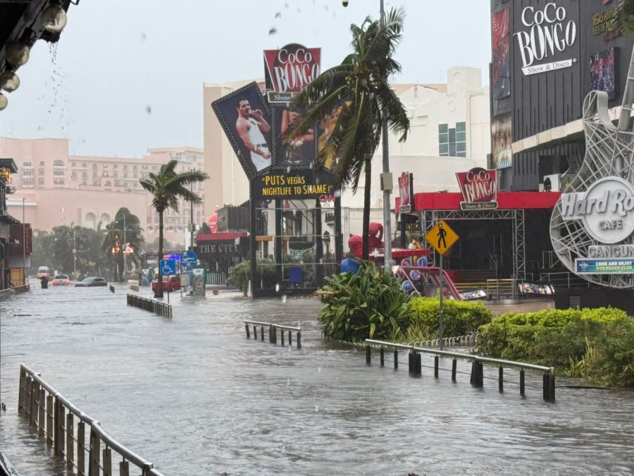 CANCÚN.- Diversos puntos sobre el bulevar Kukulkán en la Zona Hotelera permanecen inundados, debido a las intensas lluvias provocadas por el paso del huracán “Helene”.