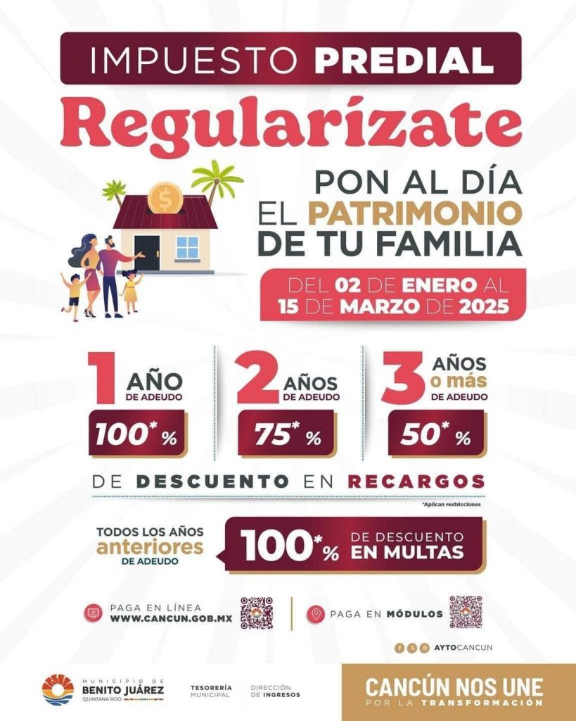 Cancún.- El Ayuntamiento de Benito Juárez, a través de la Tesorería Municipal y la dirección de Ingresos, recordó a los ciudadanos y contribuyentes que este sábado 15 de marzo vencerán dos campañas importantes para la regularización del impuesto predial.