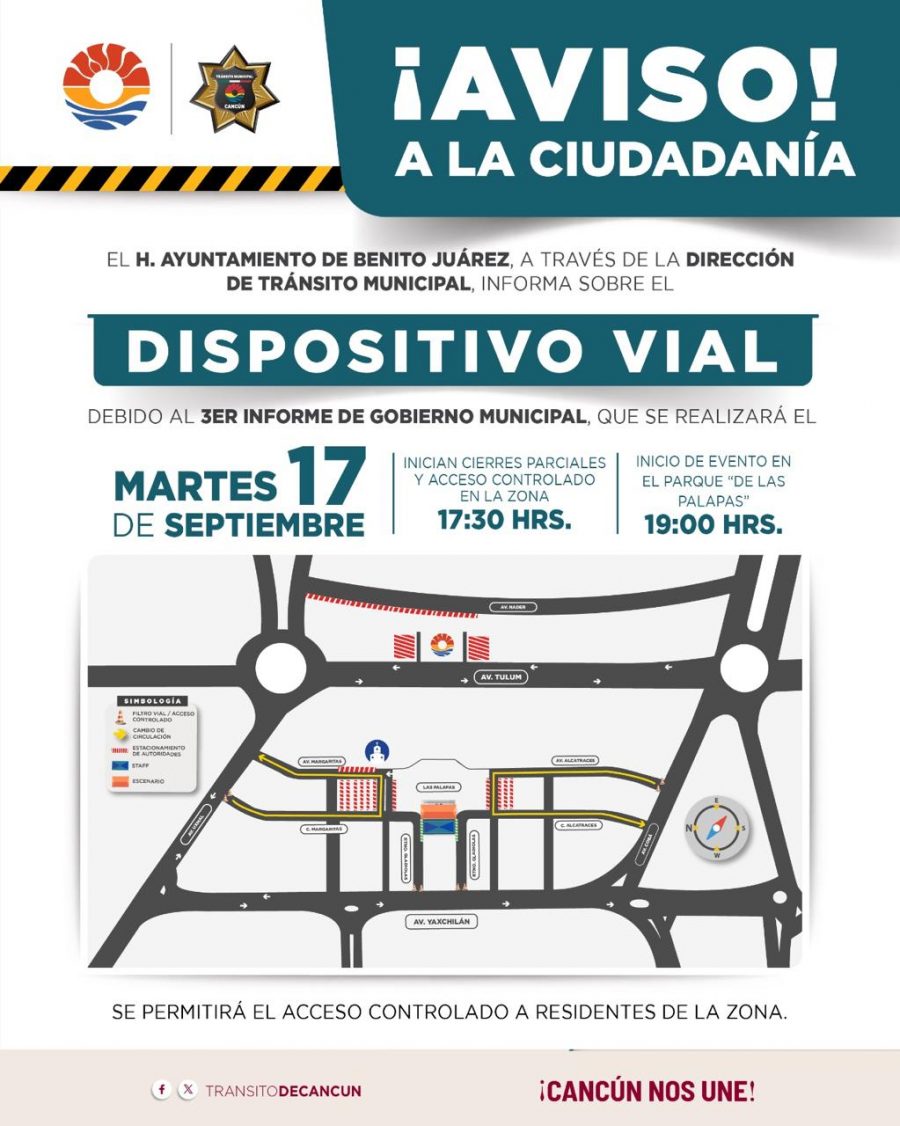 El Ayuntamiento de Benito Juárez, a través de la Dirección General de Tránsito Municipal, informa que debido al informe de gobierno de la Presidenta Municipal, Ana Paty Peralta, que se llevará a cabo este martes 17 septiembre, se realizará un operativo vial alrededor del Parque de las Palapas.