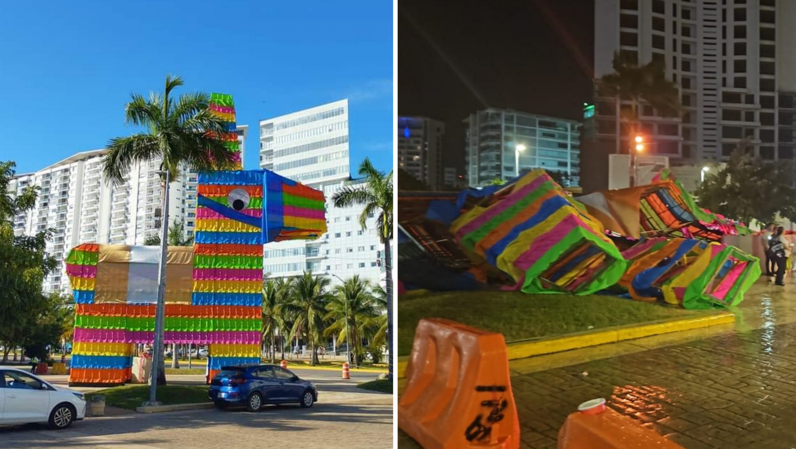 CANCÚN.- El llamado “burrito sabanero” que fue instalado en el Malecón Tajamar se derrumbó esta noche, debido a los fuertes vientos y lluvias que se han presentado por la entrada del Frente Frío número 13.