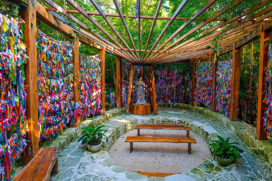 Este rincón de tranquilidad cuenta con una capilla principal; zonas de descanso, de reflexión y de meditación; una cafetería y varios arcos metálicos donde los visitantes y creyentes atan listones blancos, creando pasillos o túneles muy llamativos.