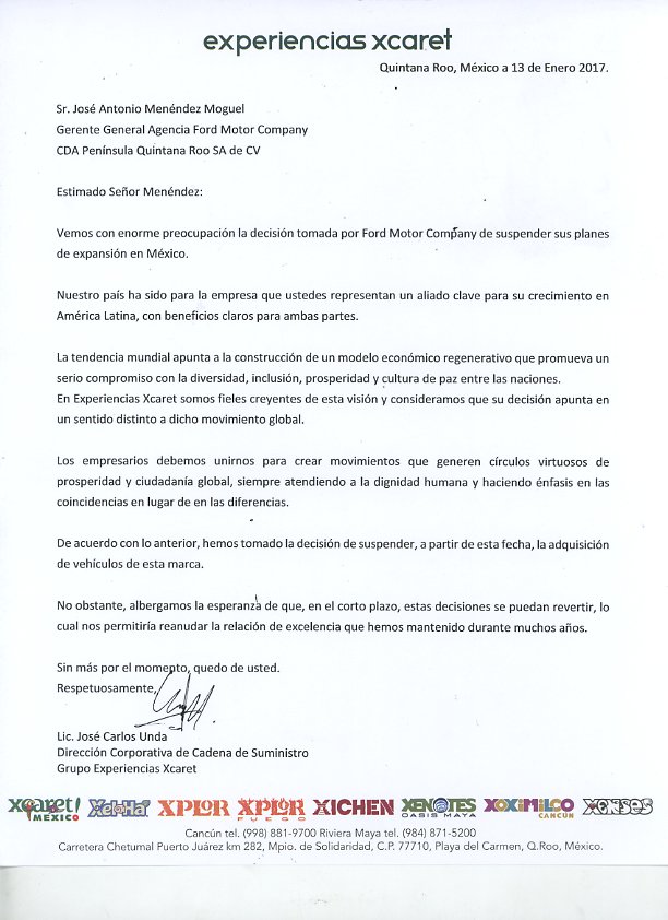 En una carta dirigida a José Antonio Menéndez Moguel, gerente general de la Agencia Ford Motor Company en la Península de Yucatán, Xcaret explica que México ha sido un aliado clave para el crecimiento de Ford en América Latina, “con beneficios claros para ambas partes”.