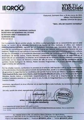 Fue a través del oficio PRE/0328/2021, dirigido al secretario de gobierno, Arturo Contreras Castillo, que la consejera presidenta del IEQROO, Mayra San Román Carrillo Medina, que dio a conocer la solicitud presentada por Iván López Díaz, en su carácter de representante suplente del partido Fuerza por México ante el Consejo General del Ieqroo para que sus candidatos a presidentes municipales de Puerto Morelos, Solidaridad y Benito Juárez “reciban resguardo de seguridad en el desarrollo de sus actividades”.