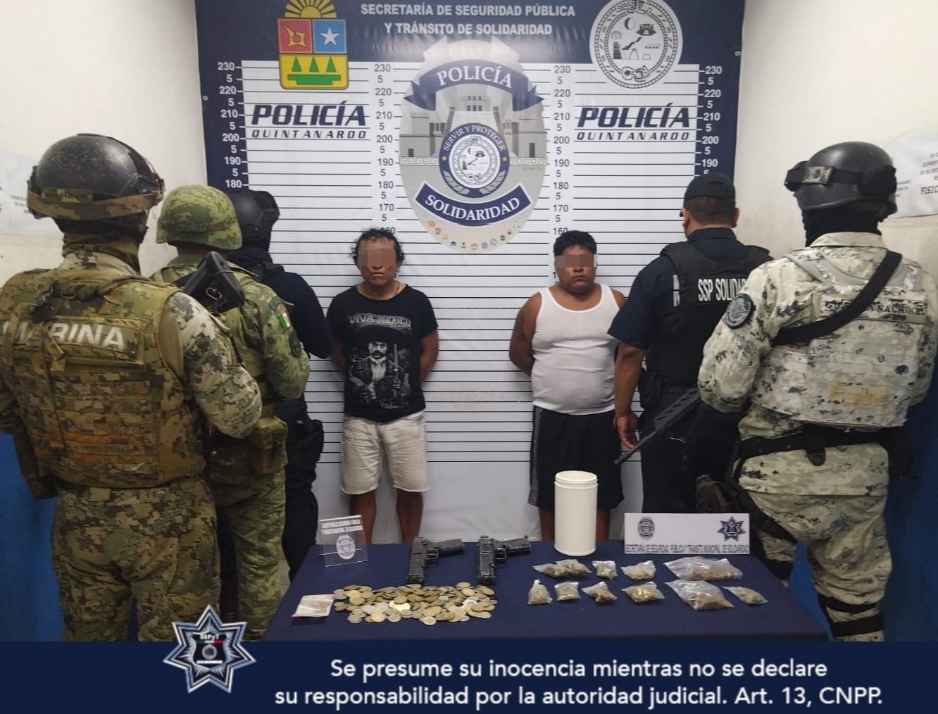 Playa del Carmen, Solidaridad a 27 de mayo de 2022.- Durante el operativo Playa Seguro, se realizó el aseguramiento de 2 sujetos en posesión de 2 réplicas de armas, 11 bosiltas con posible marihuana y dinero en efectivo, por policías de la Secretaría de Seguridad Pública y Tránsito Municipal, SEDENA, SEMAR, Guardia Nacional y Policía Quintana Roo.