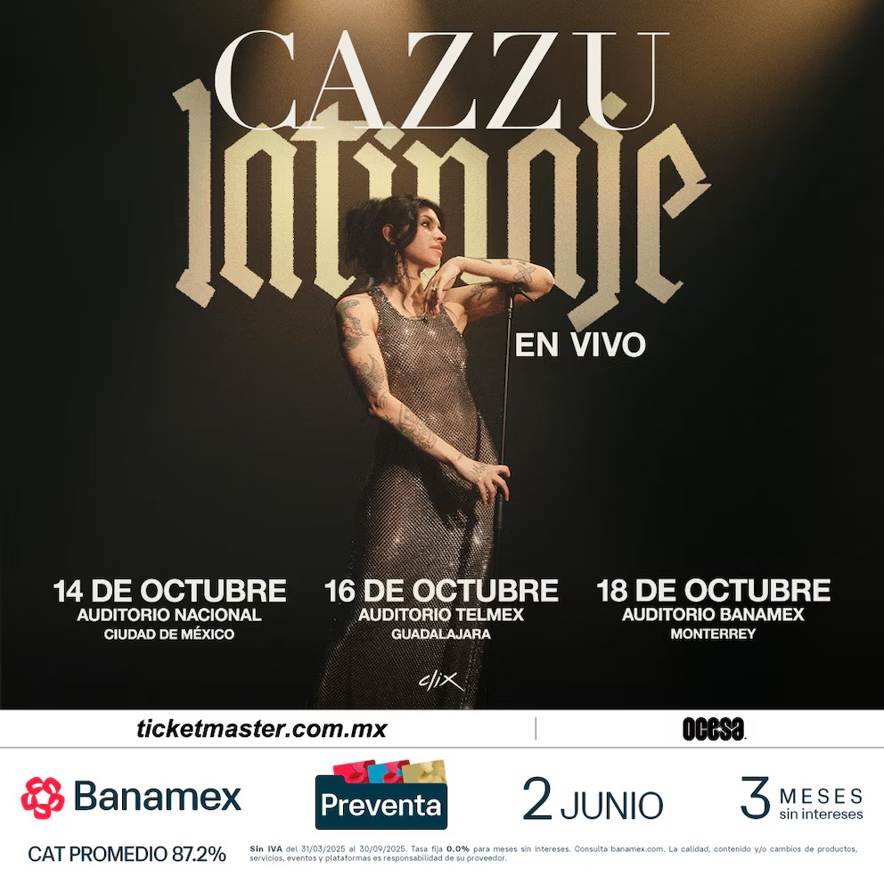 En territorio mexicano, Cazzu ofrecerá tres presentaciones: el 14 de octubre en el Auditorio Nacional (CDMX), el 16 en el Auditorio Telmex (Guadalajara) y el 18 en el Auditorio Banamex (Monterrey).