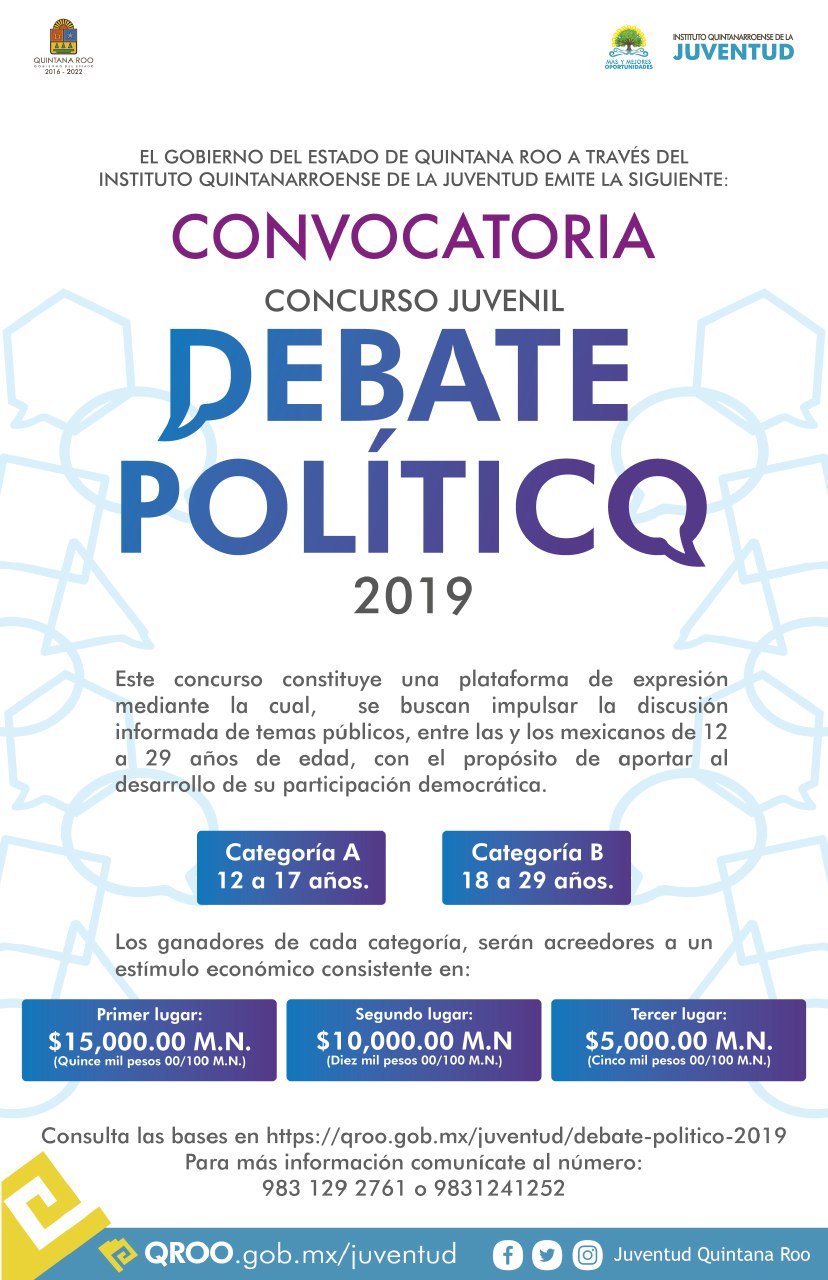 A través de esta convocatoria se busca impulsar la discusión informada de temas públicos entre las y los jóvenes quintanarroenses de entre 12 a 29 años de edad, con el propósito de aportar al desarrollo de capacidades a favor de su participación democrática.