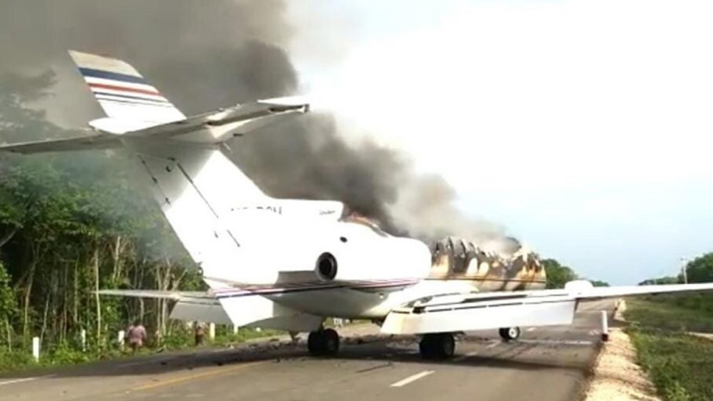 Los efectivos repelieron la agresión y descendieron sobre en el kilómetro 61 de la carretera Chunhuhub-José María Morelos, donde había un jet bimotor tipo Hawker 700, con matrícula XB-RCM, en llamas.