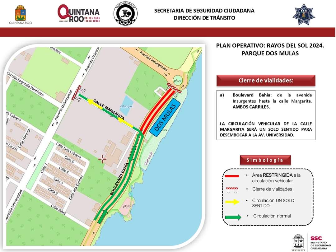 De tal motivo que el día 31 de diciembre cerrarán las vialidades alternas al balneario Dos Mulas, ubicado en la avenida Bulevar Bahía, desde la avenida Insurgentes hasta la calle Margarita en ambos carriles, ya que en este lugar se concentra el mayor número de ciudadanos. El cierre será de 22:00 horas del domingo hasta el día 1 de enero.