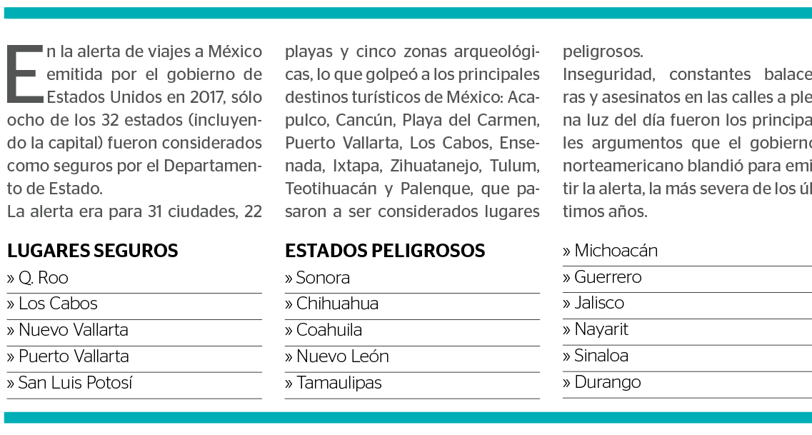 El pasado miércoles, el Departamento de Estado de Estados Unidos modificó el mecanismo de alerta de viaje, la cual clasificó por niveles del uno al cuatro. México está ubicado en el nivel dos, en donde se expone que se deben extremar precauciones para viajar. Sin embargo, cinco entidades federativas están clasificadas en nivel cuatro, en el que se recomienda no viajar: Colima, Guerrero, Michoacán, Sinaloa y Tamaulipas, las cuales están al mismo nivel que países en guerra, como Siria e Irak.