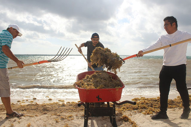 Los brigadistas coordinados por el oficial Mayor Manuel Alamilla Ceballos participaron en este servicio social que se presta a la comunidad de Mahahual, como respuesta al llamado de auxilio que le hicieron los habitantes al gobernador Carlos Joaquín para limpiar de sargazo la costa.