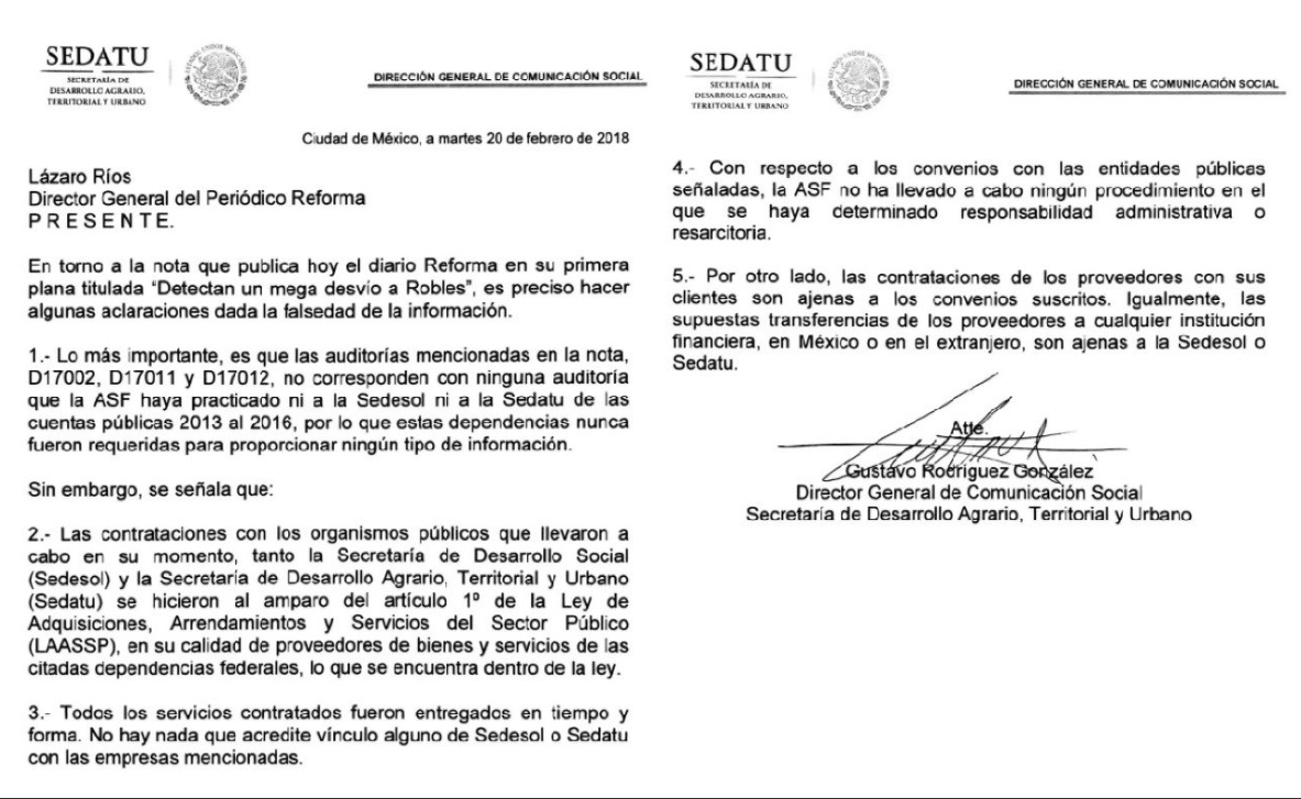 FOTO CARTA ACLARATORIA: En redes sociales, la ex titular de Sedesol publicó una carta aclaratoria de Gustavo Rodríguez, director de comunicación de la Sedatu, que niega los vínculos de la dependencia con las empresas fantasmas.