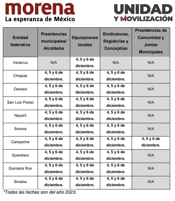 CHETUMAL.- Morena abrió el proceso de inscripción para los aspirantes a presidencias municipales, diputaciones locales y regidurías en Quintana Roo, que de acuerdo a la convocatoria publicada las fechas de registro son del 4 al 6 de diciembre.