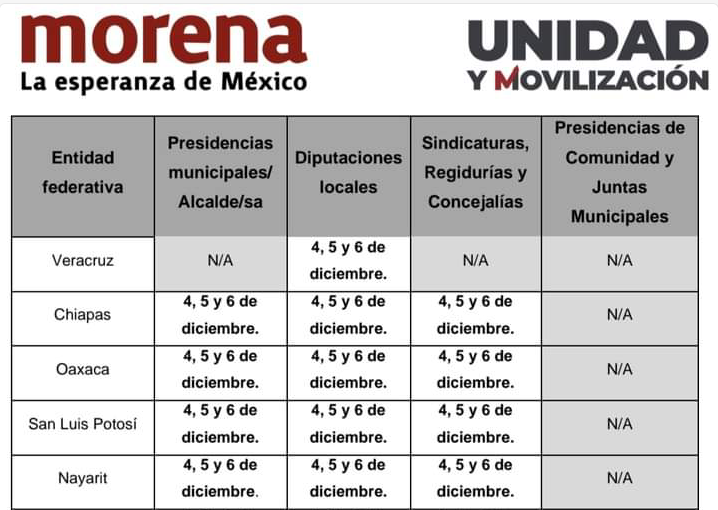 El 7 de marzo se dará a conocer quiénes son los candidatos que participarán por las presidencias municipales, el 13 de marzo se dará a conocer quienes son los candidatos a diputación por mayoría relativa, y finalmente el 20 de marzo quienes son los candidatos a diputación por representación proporcional.
