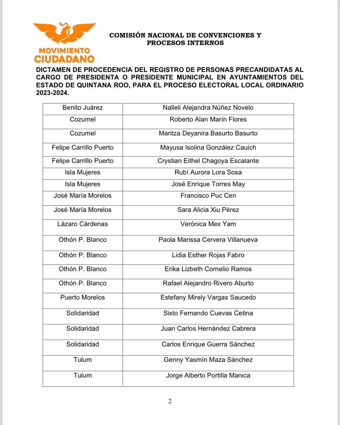 De acuerdo con el primero de los dos comunicados emitidos, dichas personas “se encontraron ajustadas a derecho al cumplir cabalmente con lo establecido en la legislación vigente del Estado de Quintana Roo; en la normatividad interna de Movimiento Ciudadano; así como en la Convocatoria de mérito”.