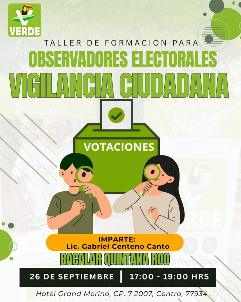 Asimismo, el viernes 26 de septiembre a las 17:00 horas, se llevará a cabo el Taller de Formación para Observadores Electorales: “Vigilancia Ciudadana”, en el Hotel Grand Merino de Bacalar, en Calle 7, Colonia Centro.