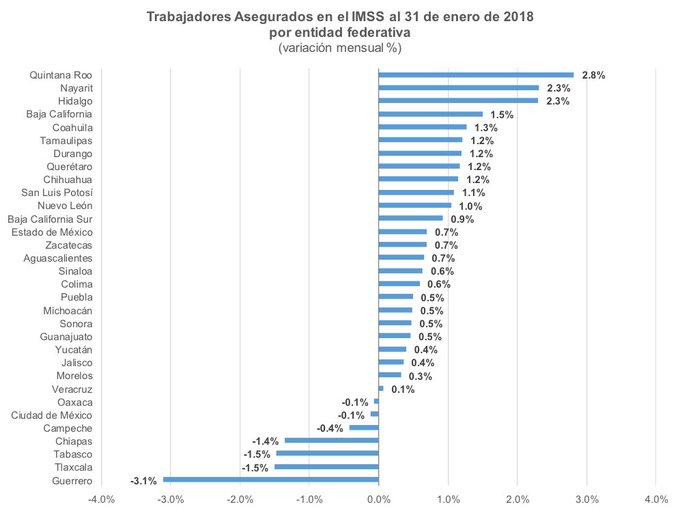Según las últimas cifras dadas a conocer por el Instituto Mexicano del Seguro Social, Quintana Roo registró un incremento porcentual de 2.8% hasta el pasado 31 de enero en el número de trabajadores afiliados, seguido por Nayarit (2.3%), Hidalgo (2.3%), Baja California (1.5%) y Coahuila (1.3%).