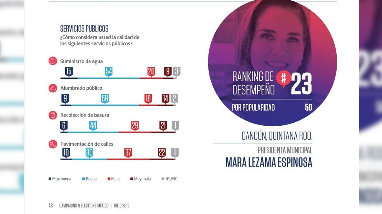 La publicación trabajó de la mano con la consultoría Varela y Asociados, para evaluar 300 presidentes municipales, de los 2 mil 458 municipos del país, quedando dos quintanarroenses en los primeros 50 lugares: Mara Lezama en el número 23 y Otoniel Segovia Martínez en el 43.