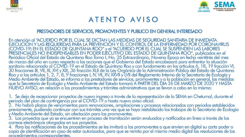 El Secretario de Ecología y Medio Ambiente Alfredo Arellano Guillermo, acorde a indicaciones del Gobernador Carlos Joaquín, informó a los prestadores de servicios, promoventes y a la población en general, las medidas que la Secretaría de Ecología y Medio Ambiente del Estado tomará a partir del día 26 de marzo de 2020 y hasta nuevo aviso, en relación a los procedimientos y trámites administrativos que se llevan a cabo en la misma: