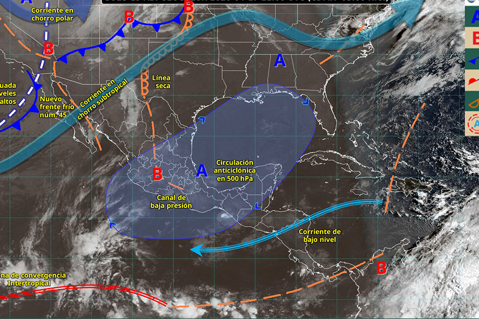 Canales de baja presión y el ingreso de humedad generarán lluvias puntuales fuertes en Chiapas, chubascos en Oaxaca y precipitaciones aisladas en el oriente, sur y sureste del país, incluida la península de Yucatán.