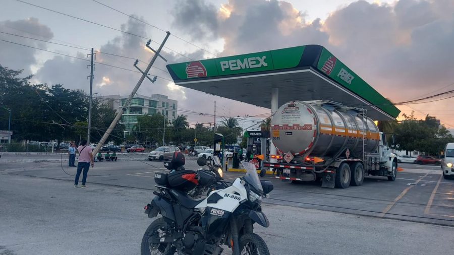 Cancún.- Un camión cisterna que trasladaba gasolina derribó un poste de la Comisión Federal de Electricidad (CFE) en la gasolinera ubicada en la avenida Bonampak de Cancún, a un costado del Superama en la Supermanzana 3.