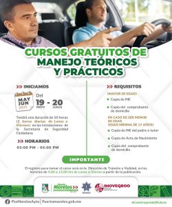 Puerto Morelos.—Luego de los buenos resultados obtenidos en el Curso de Manejo Teórico-Práctico que se impartió del 10 al 21 de marzo pasado, la Dirección de Tránsito Municipal lanzará la convocatoria para un nuevo curso, que también será totalmente gratuito, y se llevará a cabo del 19 de mayo al 20 de junio, informó su titular, Jorge Villegas Cerino.