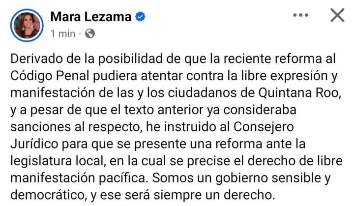 CHETUMAL.- La gobernadora Mara Lezama informó esta tarde que solicitará a la Consejería Jurídica de la administración estatal la corrección a la recién aprobada reforma al Código Penal en su artículo 182, para que se garantice el derecho a la libre manifestación.