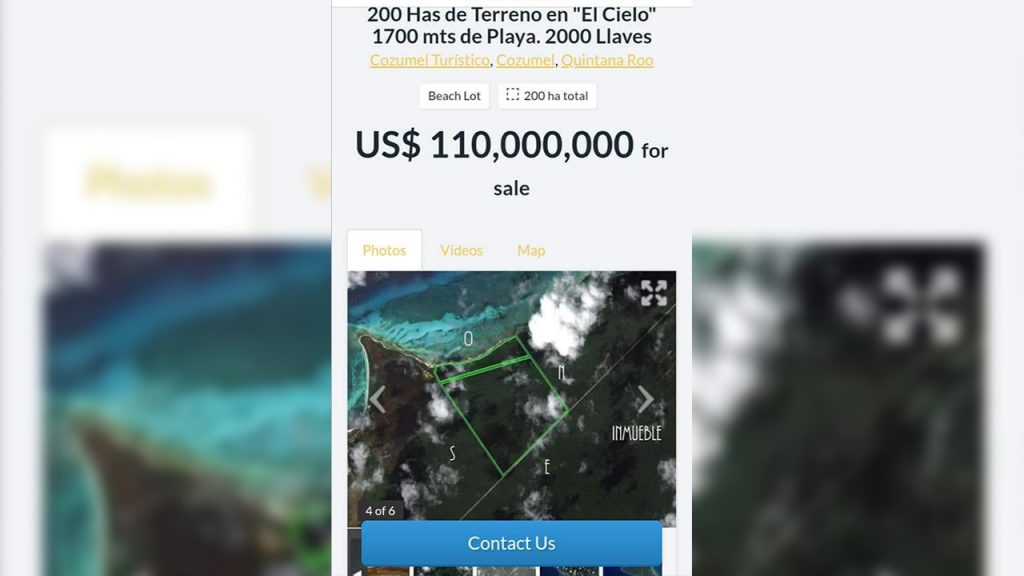 En el anuncio publicado y después borrado en redes sociales anuncia los siguientes: Esta propiedad llamada “El Cielo” es una de las más bellas playas del país y se encuentra en Cozumel. Cuenta con 1700 metros de hermosa playa de Arenas blancas y aguas cristalinas, territorio poco explorado. Su gran dimensión de terreno es de 2,000,000 de m2 con gran potencial ya que cuenta con una Densidad Turístico, Hotelero y Residencia. **CON PDU PARA 2000 LLAVES HOTELERAS*** Documentos en orden, libre de gravamen. Escriturado, listo para su venta. No te pierdas la oportunidad de tener un pedacito de “El Cielo”.