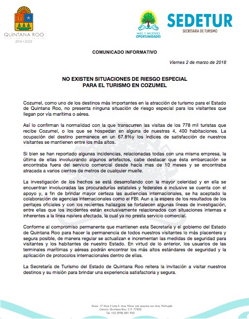 La Secretaría de Turismo del Estado de Quintana Roo reitera la invitación a visitar nuestros destinos y su misión para brindar una experiencia satisfactoria y segura.