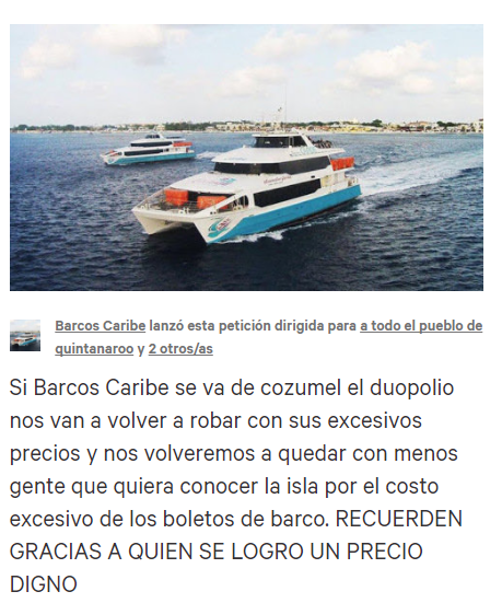 COZUMEL,Quintana Roo.- Mediante la pagina de Change.org habitantes de la Isla de Cozumel, se dieron a la labor de recolectar firmas para que las embarcaciones de Barcos del Caribe no se vaya, ya que se verían afectados más 180 empleos y a su ves ese mismo número en familias.