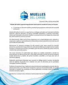 “Esta pausa representa una oportunidad para reforzar las medidas ambientales y atender las preocupaciones de algunos sectores de la sociedad cozumeleña, con el fin de que este proyecto cumpla plenamente su objetivo de generar beneficios sostenibles y de largo plazo”.