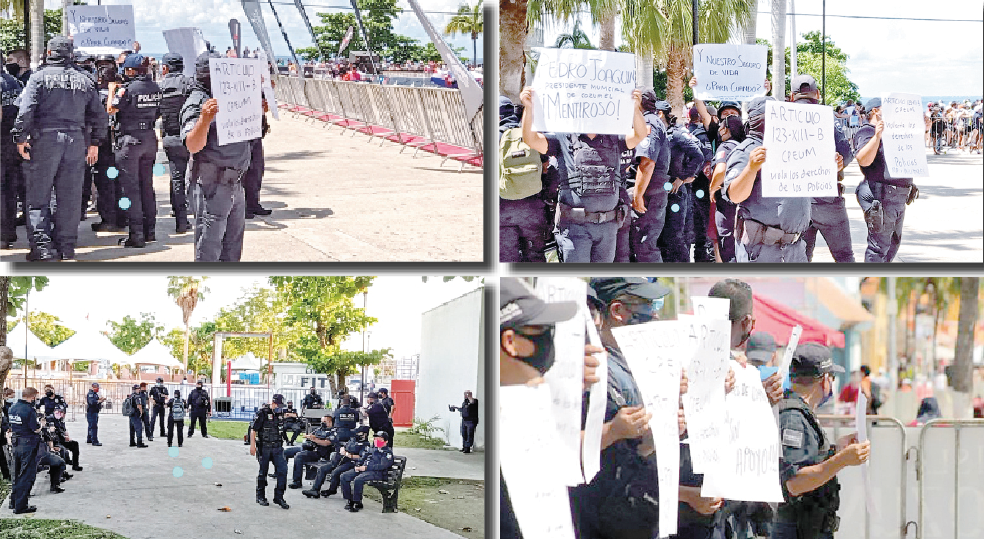COZUMEL. Pese a que estaba anunciada con mucha antelación, se llevó a cabo la protesta de policías municipales en reclamo de incumplimientos laborales, ante medios internacionales que cubrían en Iron 70.3 Cozumel 2021.