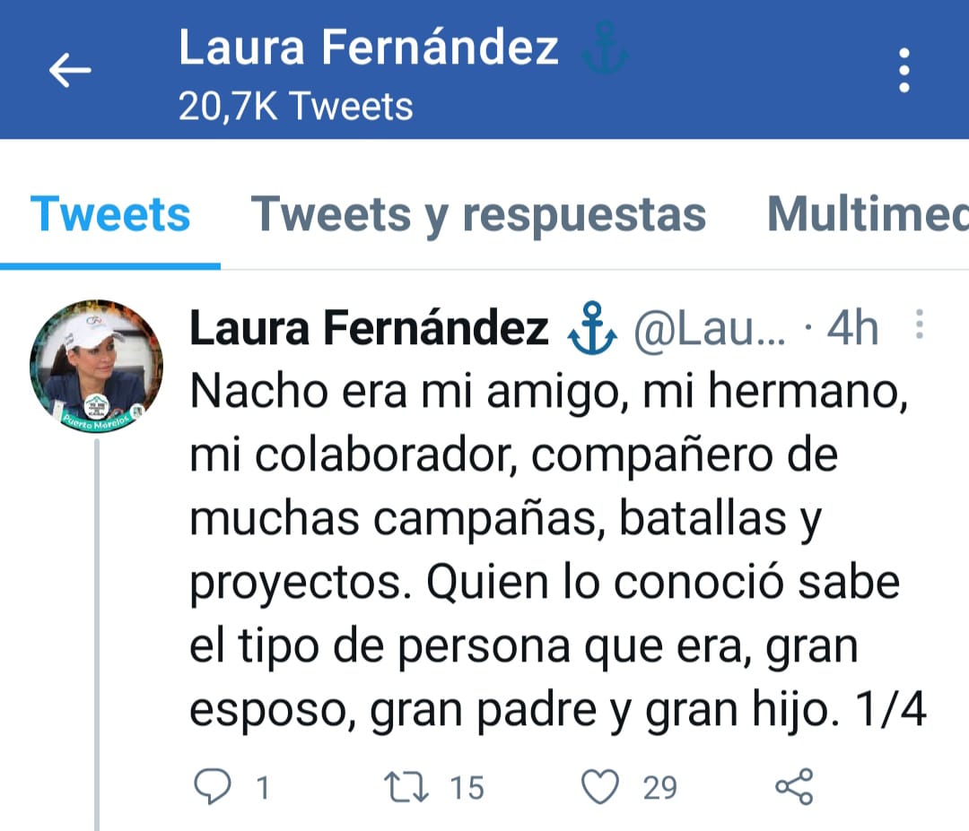 La que tardó en reaccionar y lo hizo hasta la tarde de ayer fue la presidenta municipal Laura Fernández, quien a través de su cuenta oficial en Twitter escribió: “Nacho era mi amigo, mi hermano, mi colaborador, compañero de muchas campañas, batallas y proyectos. Quien lo conoció sabe el tipo de persona que era, gran esposo, gran padre y gran hijo”.