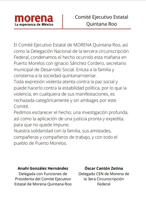 Mientras tanto, la FGE informó que inició carpeta de investigación por el homicidio del funcionario del municipio de Puerto Morelos y que de acuerdo a las primeras investigaciones indican que se trató de una agresión directa cuando la víctima se encontraba en una cafetería; derivado de las lesiones, perdió la vida en un hospital, además de que se implementó un operativo de búsqueda y rastreo para localizar al o los probable(s) participante(s).