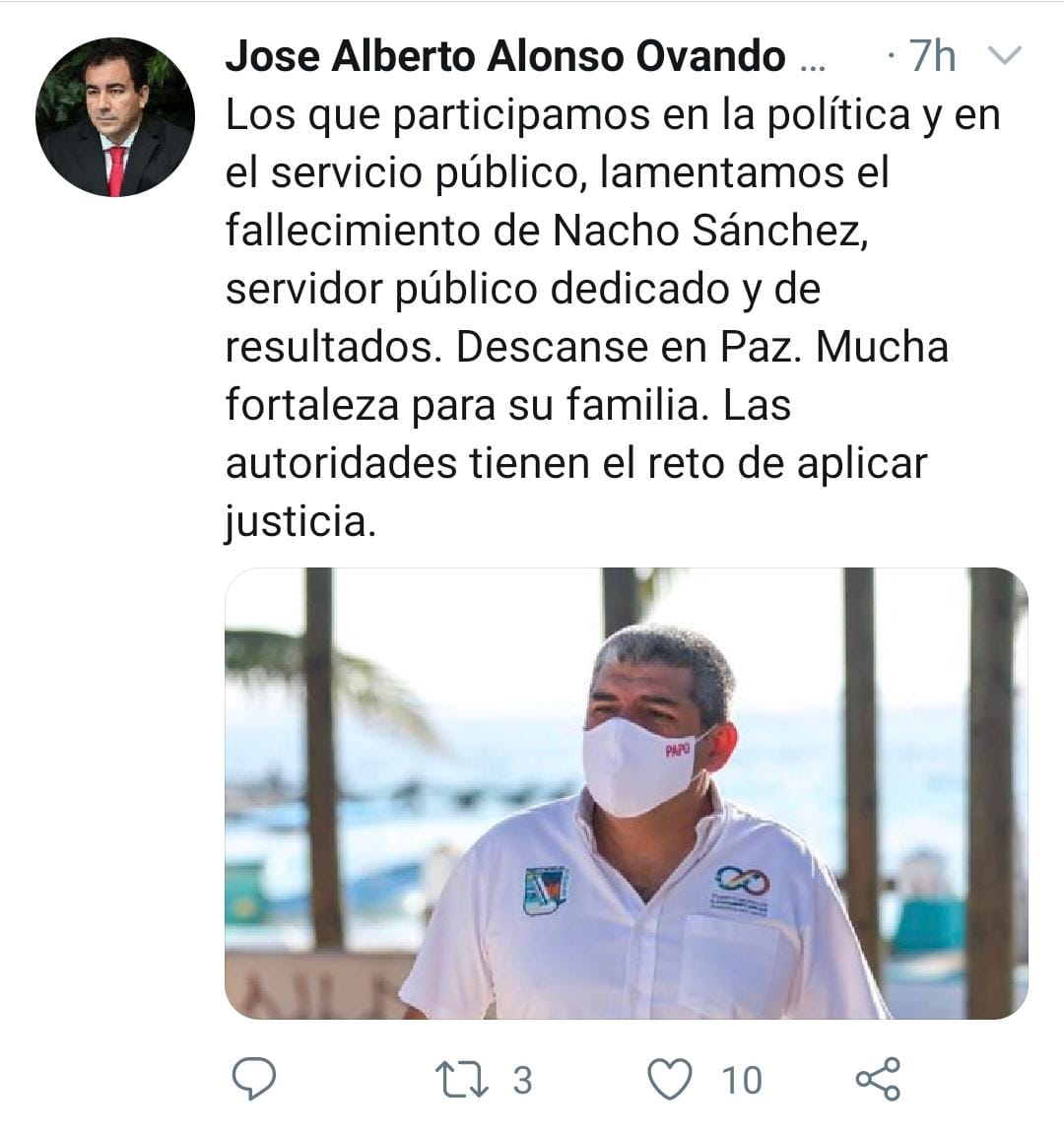 José Alberto Alonso Ovando, secretario general del PRI en Quintana Roo, también se pronunció: “Los que participamos en la política y en el servicio público, lamentamos el fallecimiento de Nacho Sánchez, servidor público dedicado y de resultados. Descanse en Paz. Mucha fortaleza para su familia. Las autoridades tienen el reto de aplicar justicia”.