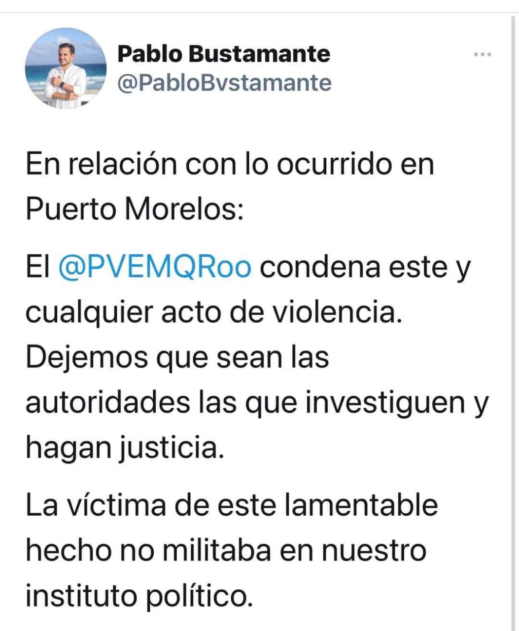 A través de twitter la Fiscalía General del Estado abrió una carpeta de investigación en contra de/los presut@/s responsables del asesinato del candidato a la presidencia de Puerto Morelos, Ignacio Sáchez, quien al momento seguía siendo servidor público como Director de Desarrollo Social de dicho municipio.