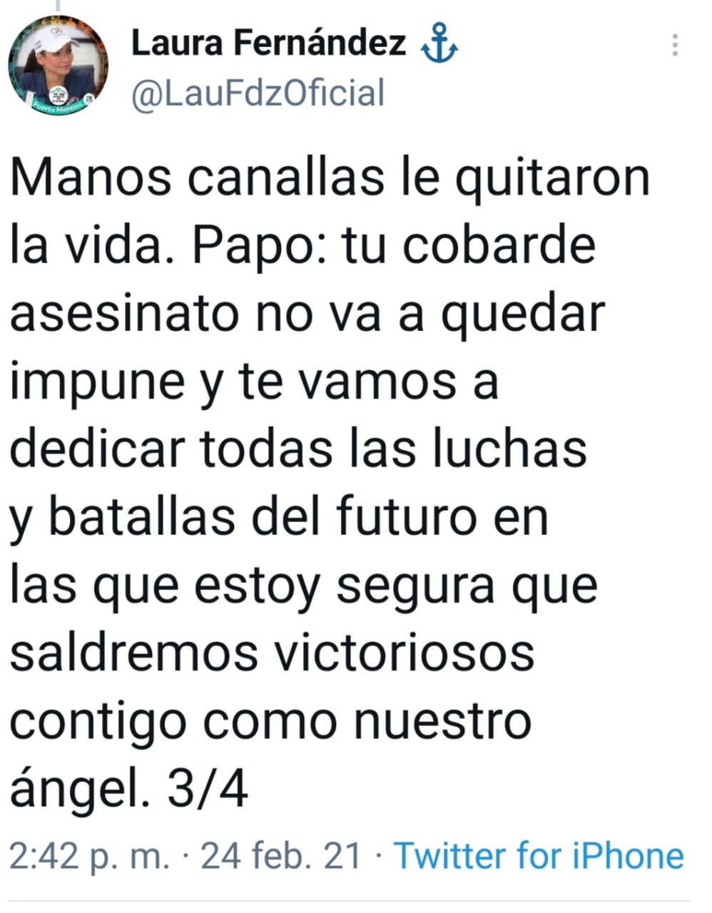 En el hilo del mensaje, Fernández Piña refirió que “Manos canallas le quitaron la vida. Papo: tu cobarde asesinato no va a quedar impune y te vamos a dedicar todas las luchas y batallas del futuro en las que estoy segura que saldremos victoriosos contigo como nuestro ángel”.