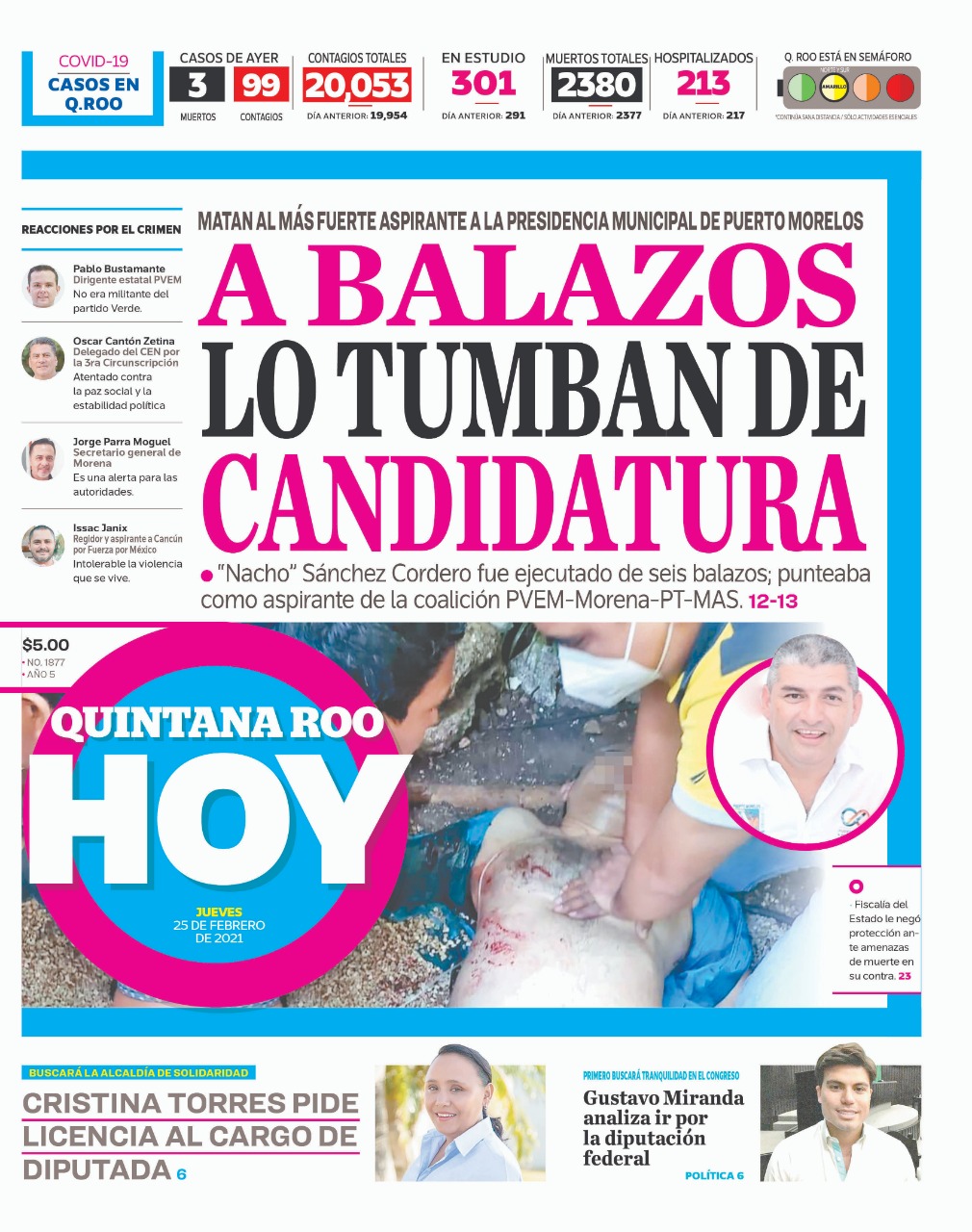 Puerto Morelos. El proceso electoral en Quintana Roo se tiñó de rojo con la ejecución del secretario municipal de Desarrollo Social en Puerto Morelos, Ignacio Josalfat “Nacho” Sánchez Cordero y quien era fuertemente impulsado por la actual alcadesa Laura Fernández Piña para ser el candidato a la presidencia municipal por la coalición PVEM-Morena-PT-MAS, que en el caso de este municipio y de acuerdo a los dirigentes de partidos, le corresponde designar la candidatura al Verde Ecologista.