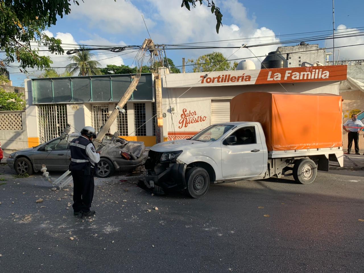 CANCÚN. El conductor de una camioneta se embarró contra un poste de electricidad que derribó y cayó sobre un auto jalando el tendido eléctrico que trajo como consecuencia que dejara sin luz a toda la manzana, en el cruce de la avenida Francisco I. Madero (Ruta 4) con calle 65 de la Supermanzana 91.
