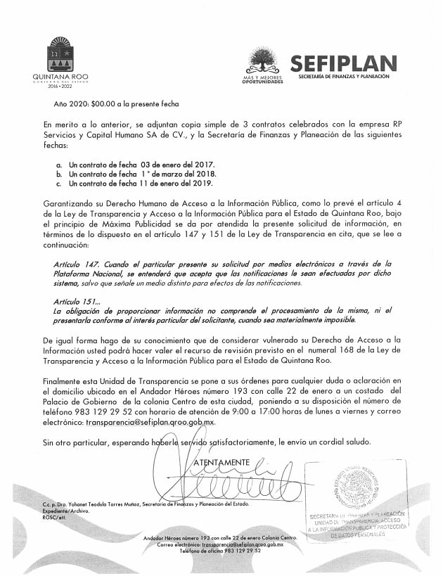 De acuerdo a datos obtenidos por la asociación “Somos Tus Ojos”, a través de la solicitud de información 00159820, en el 2017, la Sefiplan pagó a RP Servicios y Capital Humano la cantidad de 10 millones 801 mil 698 pesos; en el 2018, pagó 77 millones 625 mil 439 pesos y en el 2019, pagó 53 millones 604 mil 699 pesos, lo que hace un total de 142 millones 31 mil 836 pesos en los tres años.