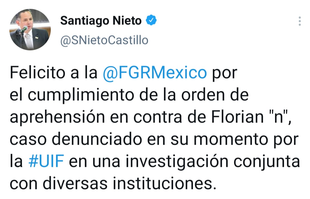 Santiago Nieto Castillo, titular de la UIF, en un tuit felicitó a la FGR de México, por el cumplimiento de la orden de aprehensión en contra del rumano, caso denunciado en su momento por esa Unidad Administrativa de la Secretaría de Hacienda y Crédito Público de México, en una investigación conjunta con diversas instituciones.