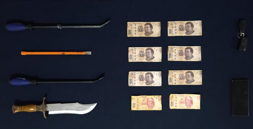 Mientras realizaban recorridos sobre la Av Mayapan de Benito Juárez, visualizaron a un vehículo gris estacionado con varias personas, quienes a simple vista portaban cuchillos. De inmediato les solicitaron una revisión asegurándoles un cuchillo de aproximadamente 20 cm, dinero en efectivo, 3 ganzúa de aproximadamente 40 cm y 30 cm.