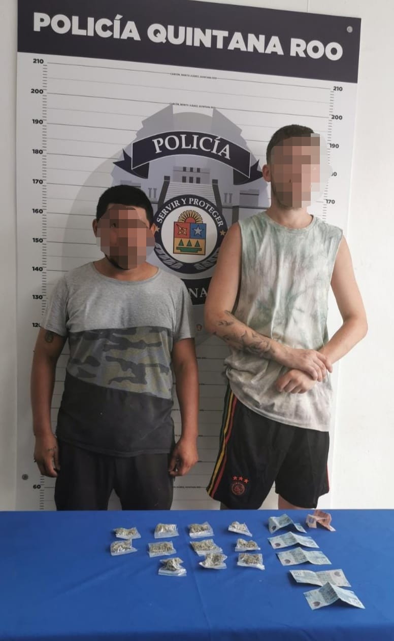 Estando en recorrido de prevención y vigilancia nos percatamos de dos personas de sexo masculino mismo que se encontraban en intercambio de algo cuando se percatan de la presencia de la unidad de seguridad pública intentan salir corriendo por lo que se les da alcance percatándonos que entre su ropa tenían bolsas pequeñas color transparente que en el interior contiene hierva seca con características a la marihuana por lo que son detenidos y trasladados a los patios de la secretaria de seguridad pública
