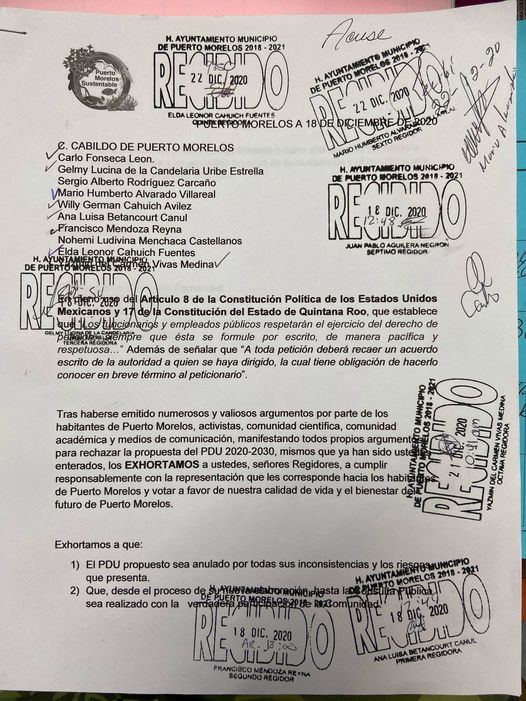 PUERTO MORELOS. Tras haber emitido numerosos argumentos por parte de los habitantes de Puerto Morelos, así como activistas, comunidad científica y académica, todos ellos, integrantes del colectivo “Puerto Morelos Sustentable”, ahora ingresaron un exhorto para todos los integrantes del Cabildo para que frenen el Plan de Desarrollo Urbano (PDU) y que se realice un Plan de ordenamiento Ecológico Local (POEL).