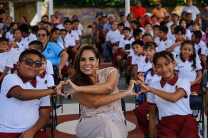 Acompañaron a la Gobernadora en la primera fila de la ceremonia de inauguración la presidenta honoraria del Sistema DIF Quintana Roo, Verónica Lezama Espinosa; el presidente municipal de Lázaro Cárdenas, Nivardo Mena Villanueva; los alumnos Santiago Hafid Quintal Betancourt, del 6° A, y Valeria Asunción Melchor Tuz, también del 6° A; la secretaria de Educación, Elda Xix Euán; el secretario de Obras Públicas, José Rafael Lara Díaz; y el director de la primaria, Walditrudis Baas Tuz.