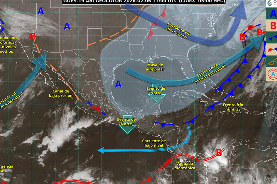 Aunque el frente frío 33 ya se extiende sobre el Mar Caribe y deja de afectar directamente al país, su masa de aire polar continúa influyendo. Esta cobertura alcanza al noreste, centro, oriente y sureste de México, incluida la Península de Yucatán.