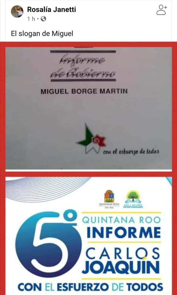 Rosalía Janetti de Borge, exprimera dama y esposa del exgobernador de Quintan Roo, Miguel Borge Martín, exhibió al gobernador actual Carlos Joaquín por la falta de creativida al plagiar el eslogan de gobierno del exmandatario