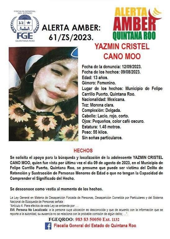 Felipe Carrillo Puerto.- Familiares de Yasmín Cristal Cano Moo, de tan sólo 13 años, denunciaron la desaparición de la menor ante la Fiscalía General del Estado, por lo que esta corporación activó la noche de este martes la ‘Alerta de Amber’ correspondiente.