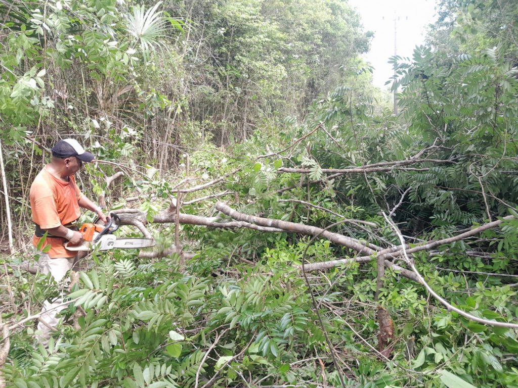 Felipe Carrillo Puerto.- Suma fuerzas la Comisión Federal de Electricidad CFE con campesinos de las comunidades para despejar el tendido eléctrico que las ramas de árboles han alcanzado causando fallas en el suministro eléctrico.