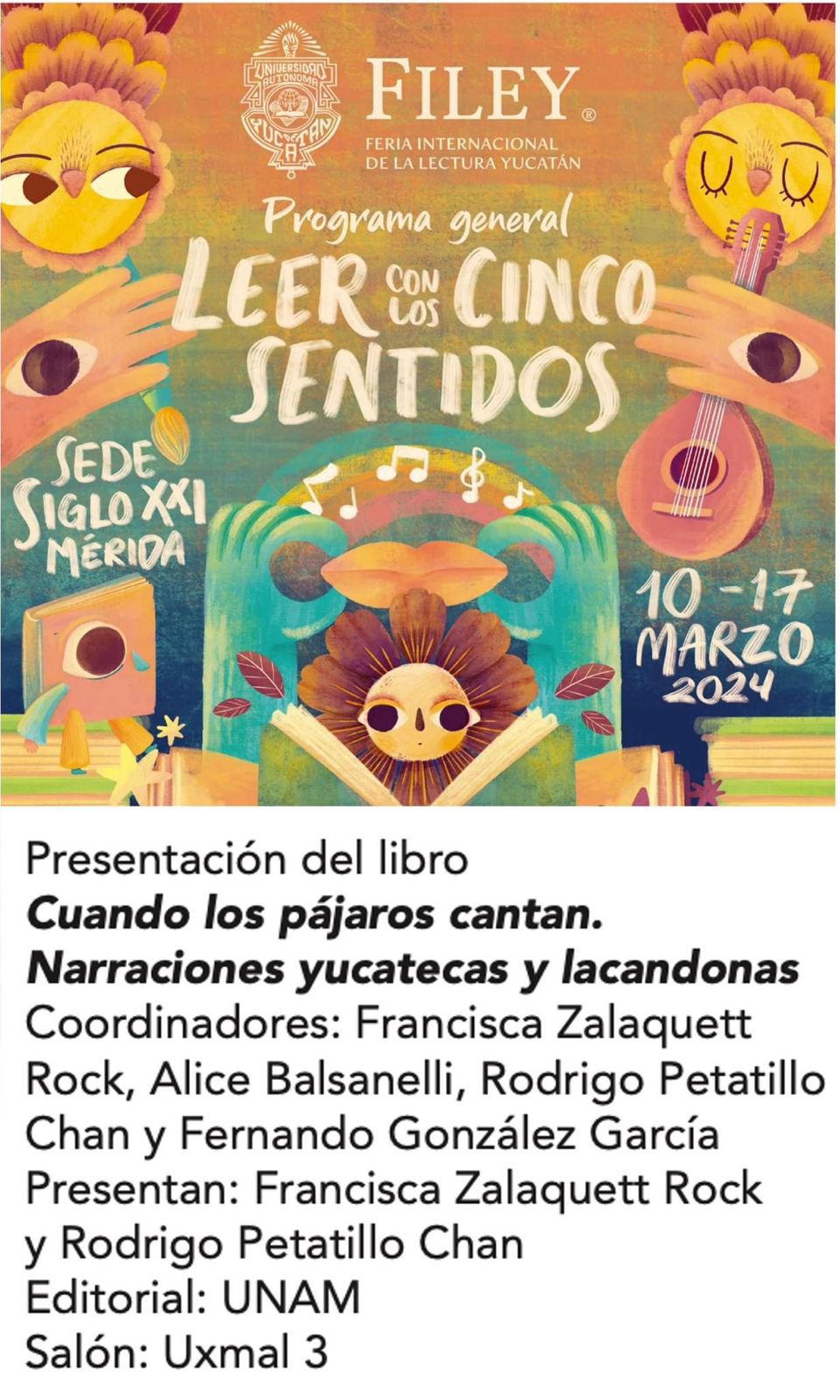 “Estaremos presentando el libro: Ken k’aaynak le ch’íich’o’obo’. Tsikbalo’ob ich maaya t’aan yéetel lakandoon – Tuk’in kuk’äy a ch’iich’. Utzikb’aar yukatekos yetel jach winik “Cuando los pájaros cantan. Narraciones yucatecas y lacandones”. Indicó