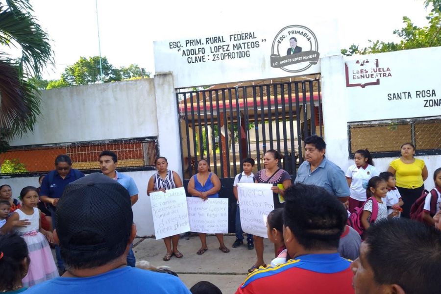 Durante la hora de entrada, los padres se manifestaron frente a la escuela, ubicada en el centro de la localidad, portando cartulinas en las que pedían la destitución del director Heisler Cetz.